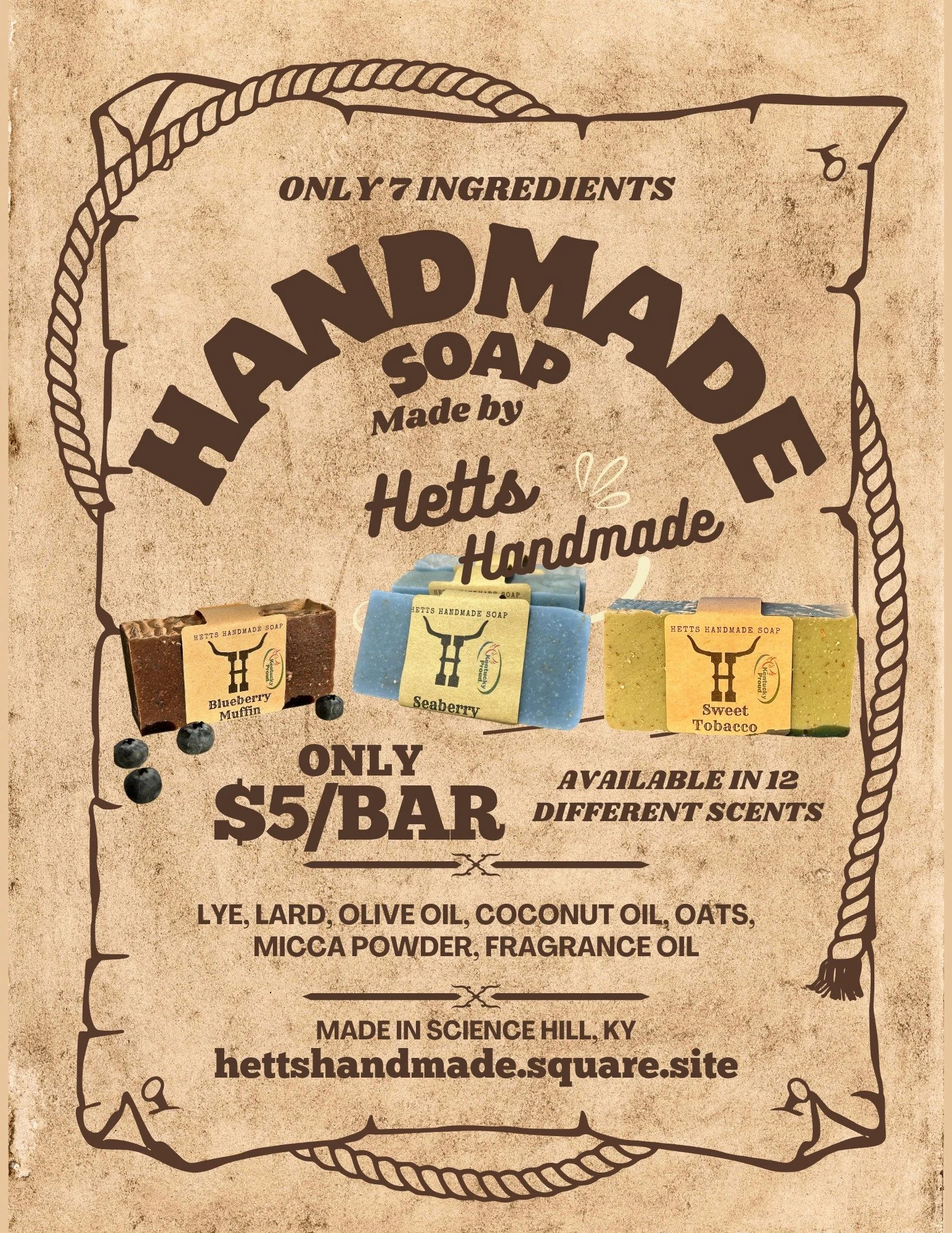“Here at Hetts Handmade we make small batch handmade soap with only 7 ingredients, we offer hair bars as well. We will also be offering herbal salve and whipped tallow!”
